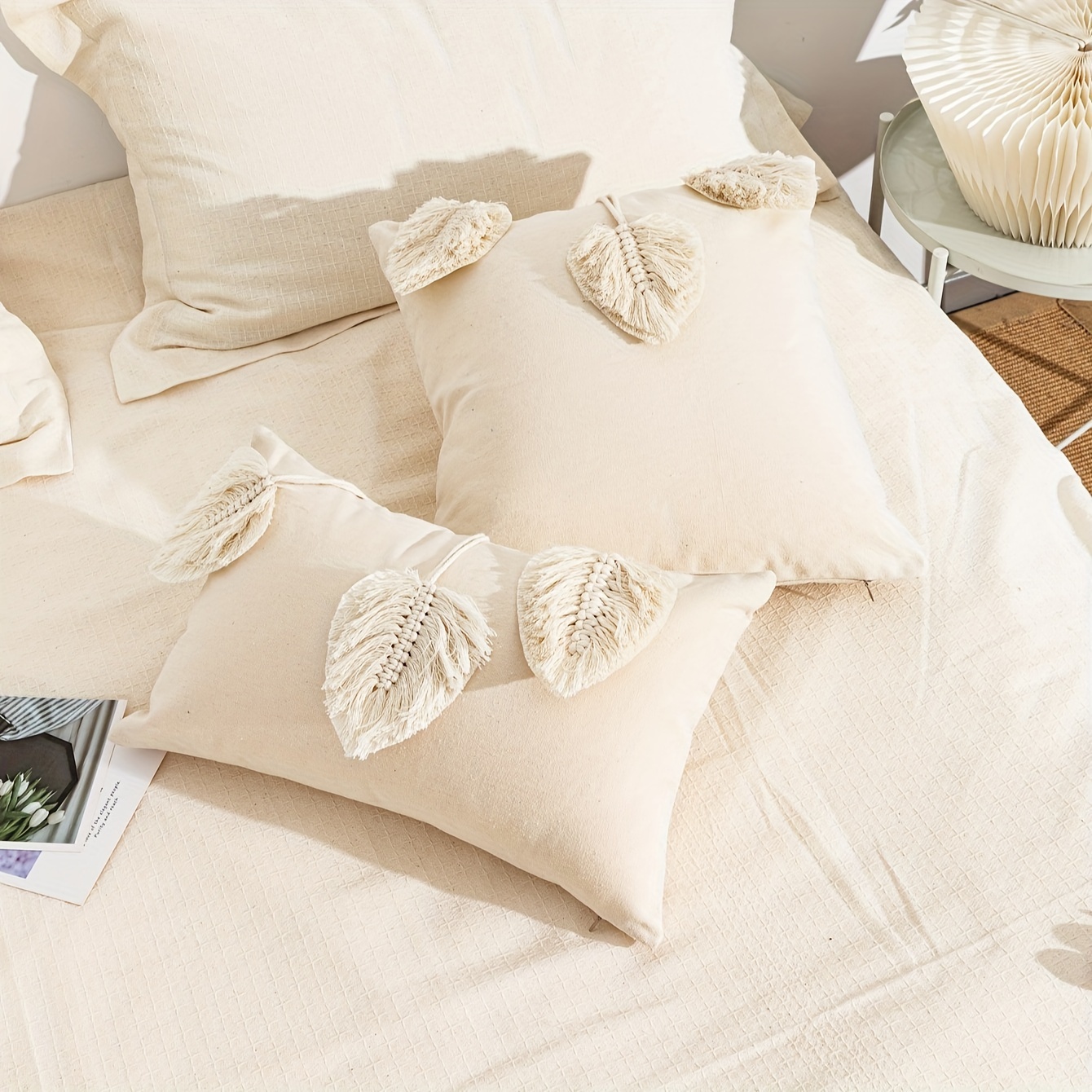 Apportez une touche d'élégance bohème à votre intérieur avec notre housse de coussin capitonnée à motif de feuilles blanches. Cette housse décorative arbore un magnifique motif de feuilles macramés qui insuffle une ambiance naturelle et chaleureuse à n'importe quelle pièce. Son tissu doux et résistant est idéal pour se détendre, tandis que sa fermeture éclair invisible facilite le lavage. Cette housse de coussin s'harmonise avec différents styles de décoration et trouvera parfaitement sa place dans votre salon, votre chambre ou tout autre espace nécessitant une touche de confort et d'élégance. Sublimez votre décoration intérieure avec le charme et le raffinement de notre housse de coussin capitonnée à motif de feuilles blanches.