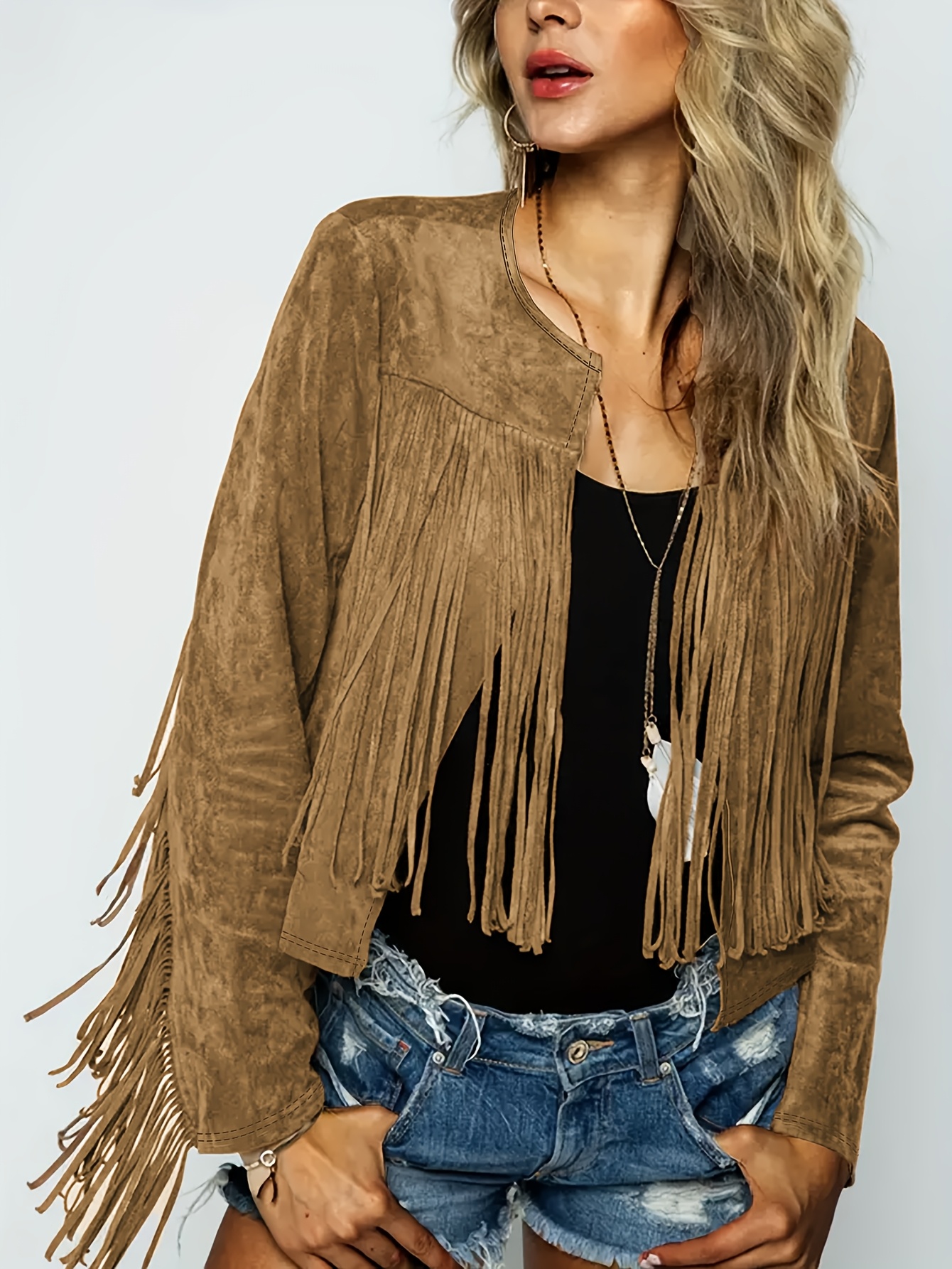 Découvrez notre veste manche longue bohème en faux daim à franges, le complément idéal de votre garde-robe bohème. Cette veste à manches longues est confectionnée en faux daim doux qui apporte une touche luxueuse à toutes vos tenues. Ses franges d'inspiration bohème subliment le look, lui conférant une touche vintage et décontractée. Que vous vous rendiez à un festival de musique ou que vous cherchiez simplement à ajouter une touche bohème chic à votre tenue quotidienne, cette veste est un choix polyvalent et élégant. Associez-la à une robe fluide ou à votre jean préféré pour un look bohème décontracté.